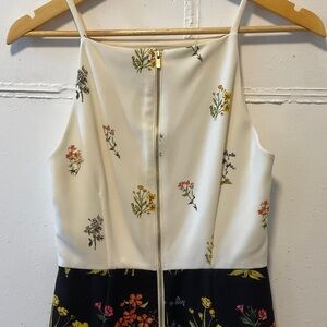 Elegant midi dress featuring a cream top with delicate floral accents and a black skirt adorned with vibrant floral patterns. Perfect for any occasion.
