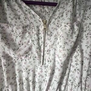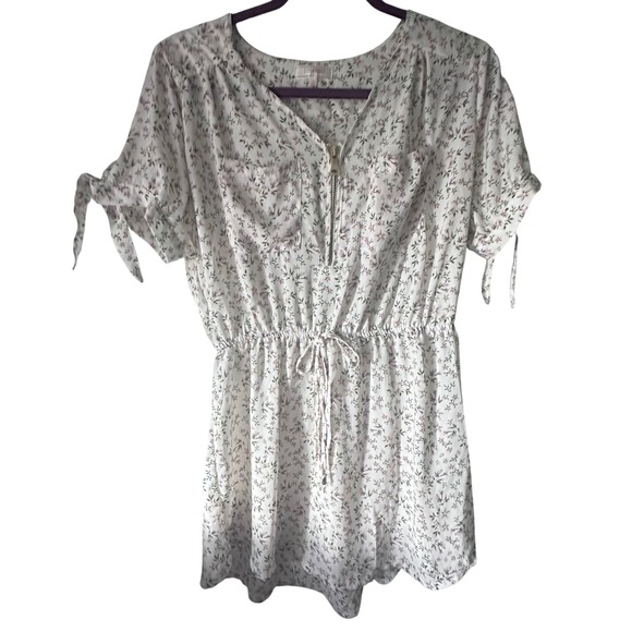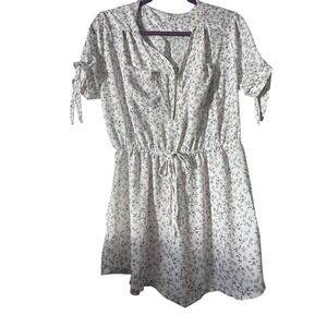 Charming floral mini dress, perfect for warm weather adventures. This adorable dress features a delicate floral print in pink and green hues against a crisp white backdrop. Design includes a v-neckline with a partial zipper, short sleeves with tie details, a drawstring waist to cinch the silhouette, and two functional chest pockets. This versatile dress is ideal for brunch dates, garden parties, or a casual day out.