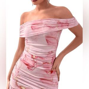 Feature: Floral print, off shoulder, short sleeve, ruched detail, split thigh, party dress