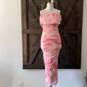 Floral Print Off Shoulder Short Sleeve Ruched Bodycon Long Dress
