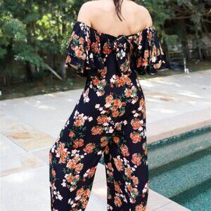 Floral Print Off-The-Shoulder Flare Sleeve Back Tie Detail Wide Leg Jumpsuit