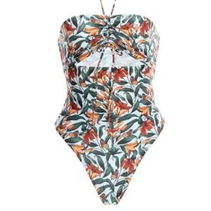 Dive into style with this vibrant floral print one piece swimsuit. Featuring a stunning mix of orange and green hues, this swimsuit is perfect for a day at the beach or pool.