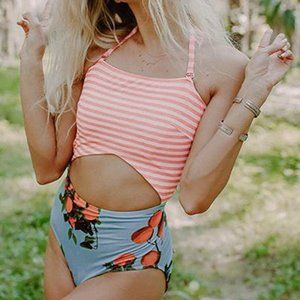 Floral Print Patchwork Stripes One-piece Swimsuit. barbiecore