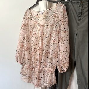 Boho Fabulous Blouse Floral Print Peach Pink Green Golden Yellow Women's Blouse Long Sleeve Cinch Waist Size Medium