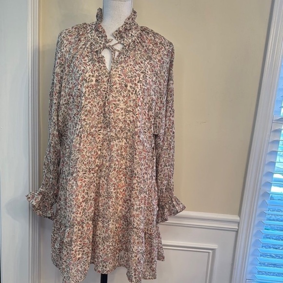 Elegant floral dress with ruffle accents. Features long sleeves and a relaxed fit.
