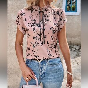 Elevate your style with this elegant floral print blouse. Featuring a charming ruffle neck and delicate black floral patterns on a soft pink background, this top is perfect for any occasion. 95% polyester, 5% elastane.