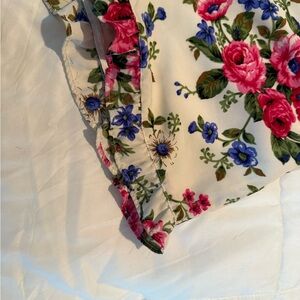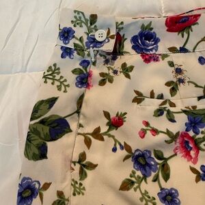 Chic floral print shorts with ruffle details. Features vibrant pink and blue flowers on a cream background.