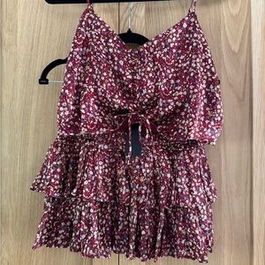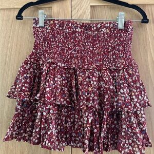 Embrace elegance with this fall floral print ruffle skirt and crop tank set. Perfect for any occasion, its vibrant colors add a touch of charm to your wardrobe. Smocked waist on skirt, adjustable straps on top.