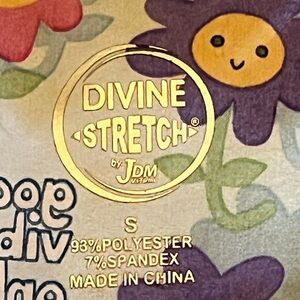 Colorful floral print scrub top with short sleeves. Features vibrant flowers and text design.
