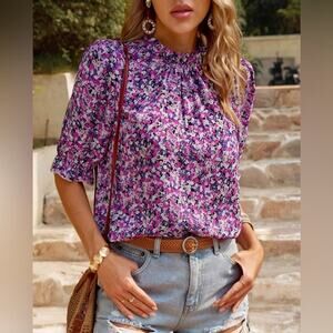 Floral Print Short Sleeve Blouse| Mock Neck with Ruffles
