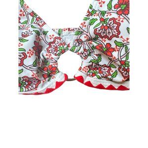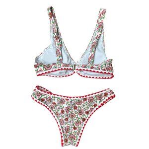 This floral bikini set with vibrant red accents evokes tropical vibes. Adjustable straps ensure a comfortable fit, while the back closure adds security.