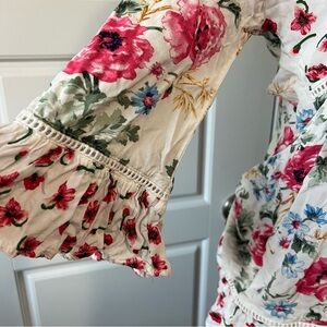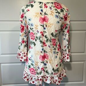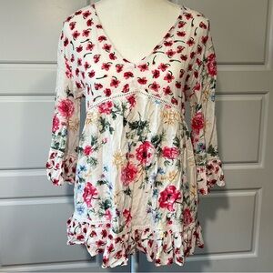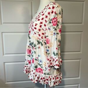 Floral Print White Tunic Top Ruffle Hem V Neck Long Sleeve Bohemian Style Small