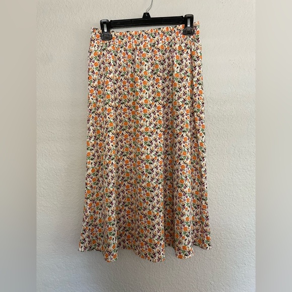 Embrace elegance with this floral print skirt, featuring vibrant orange and purple hues. Perfect for any occasion.