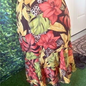 Vibrant floral print skirt featuring red and yellow hues. Perfect for adding a pop of color to your wardrobe.