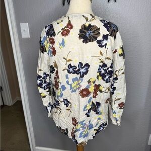 This stylish floral print top features a blend of cream, blue, and red hues. Perfect for adding a touch of elegance to your wardrobe.
