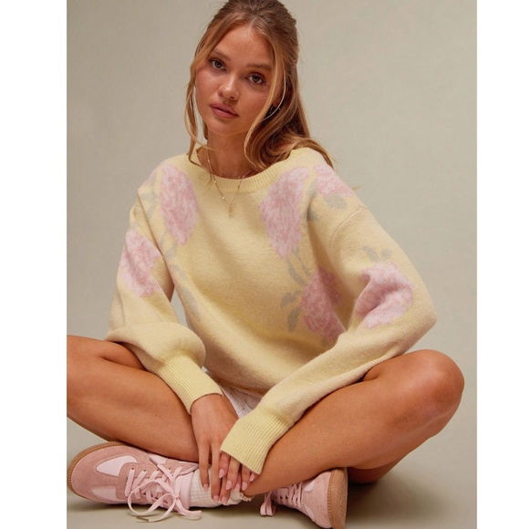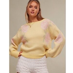 Floral Print Yellow Knit Round Neck Long Sleeve Pullover Sweater