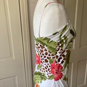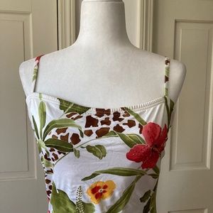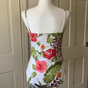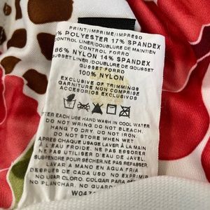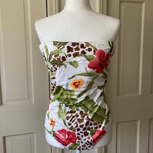 Strapless full coverage bottom, bathing suit with spaghetti straps, may be tucked in for strapless look. Fully lined with lightly padded shelf bra. Slight discoloration just below the shelf bra, please see photo. Bathing suit is clean and in great condition. ONLY WORN a FEW TIMES.
