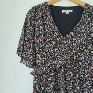 Floral Print Black Dress Small V-Neck Flutter Sleeve