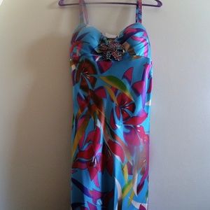 Feel like a beach princess with this colorful floral dress. It has a beautiful mermaid bottom that goes out slightly and a rhinestone flower broach in the center of the dress. I felt beautiful in this dress and I know you will too!