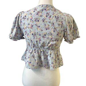 Floral Puff Sleeve Cropped Blouse With Button Front & Tie Detail -Junior Size L