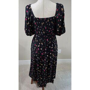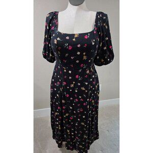 Floral Puff Sleeve Midi Dress With Pockets Black Multicolor