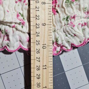 This floral puff sleeve crop top features a smocked bodice and a ruffled hemline, offering a feminine and stylish addition to any wardrobe.