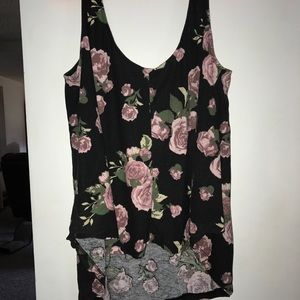 Cute black tank top with floral print, only worn to try on so basically new! It has a high/low seam. Very flowy material, it's adorable on!