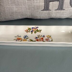 Elegant rectangular porcelain tray with colorful floral design. Perfect for decor or serving.
