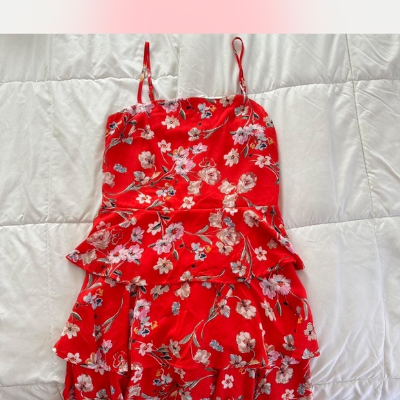 Vibrant red dress with floral print and ruffle details. Perfect for any occasion.