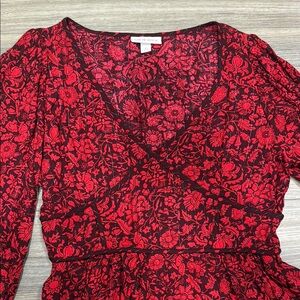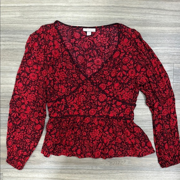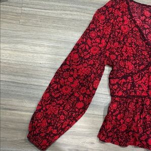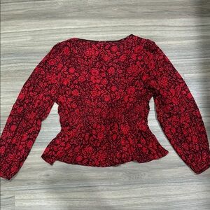 Floral red top with peplum hem and fitted bodice with corset like detailing. Perfect for date night or girls night out. Subtle silver metallic lured running through. Elastic backside.