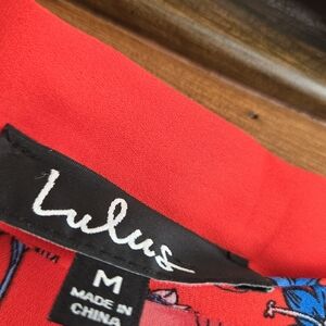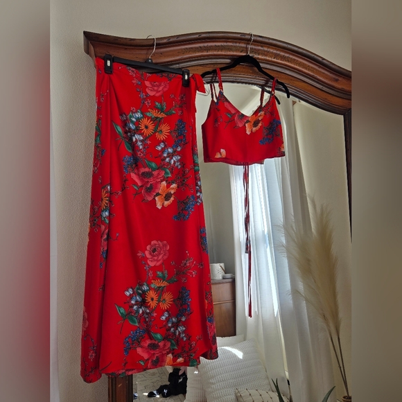 Vibrant red two-piece set with floral design. Includes a crop top and matching skirt. Perfect for a bold look.