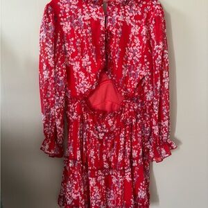 Chic red dress with floral pattern. Features a V-neck and long sleeves.