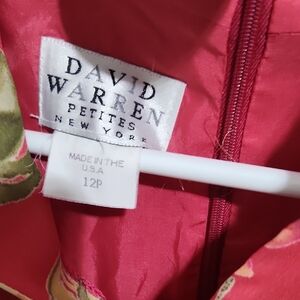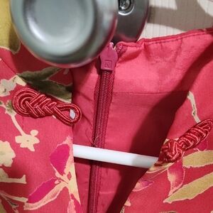 Elegant floral dress featuring a vibrant red and green design. Perfect for any occasion.