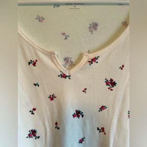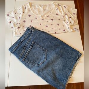 This floral tee is very soft and comfortable. Cute “V” detail on neckline. Casual and feminine design. 57% Cotton 38% Polyester 5% Spandex. Denim skirt and sandals in photos are separate listings in my closet 🙂 All 3 would make the perfect spring/summer ensemble!