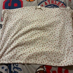 Chic floral ribbed tube top. Features a charming floral pattern on a cream background.