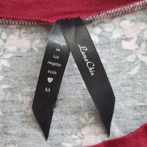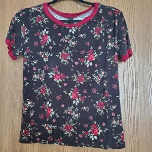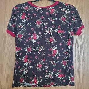 Black short sleeve tshirt with red floral pattern and red accent rings on the neckline and sleeves