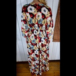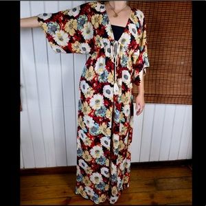Beautiful floral robe, can be used as a bathing suit cover up or paired with a simple dress and heels for night out. The length is approximately 57 inches. Material unknown. Size medium