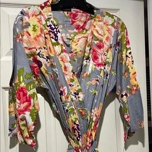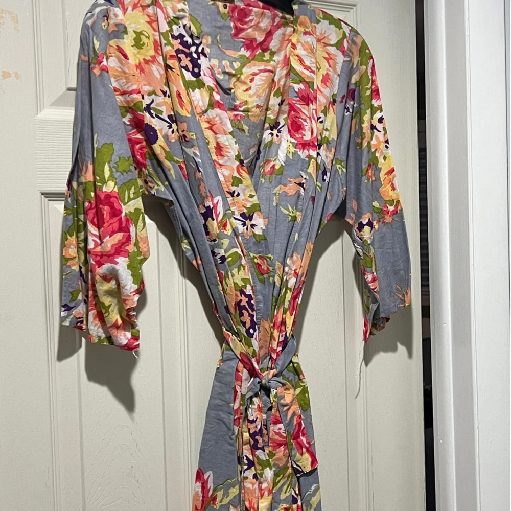 Stylish floral robe with vibrant colors. Perfect for travel or a bridesmaid.