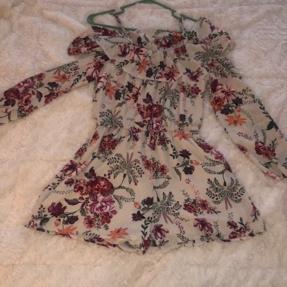 PRE-OWNED. Never worn (No tags). Floral off the shoulder long sleeved Romper. Womens Size S