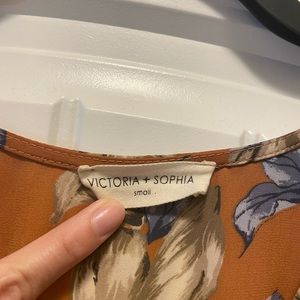 Victoria + Sophia brand romper size Small in a Rust Orange color with floral pattern. The sleeves are flared with a slit, as seen in picture. Purchased from a local boutique. Gently worn.