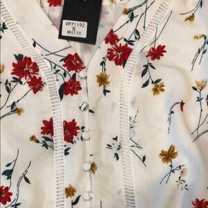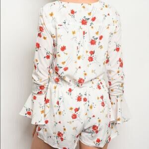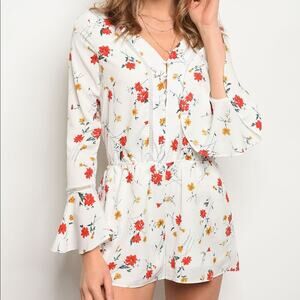 White floral bell sleeve smock waist romper. Lined. 100% polyester. Button detail at chest (sits over lining). Elastic stretch waist.