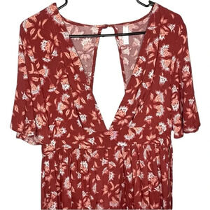 This beautiful Xhilaration romper doubles as a maxi dress, featuring a charming dusty rose floral print. Its keyhole low back detail adds allure, while the zipper on the back skirt area ensures convenience. With flutter sleeves, a deep V neckline, and an empire waist with tie backs, it offers both style and comfort.