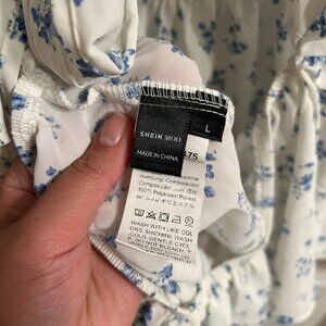 Adorable floral romper perfect for warm weather days. This romper features a charming blue floral print on a white background. It has a flattering silhouette with a sleeveless design, adjustable spaghetti straps, and a button-front detail. The back features a stylish tie closure, adding a touch of elegance. This romper also has a comfortable fit with a built-in short lining. Ideal for casual outings, picnics in the park, or summer festivals, this romper will keep you stylish and comfortable all day long.
