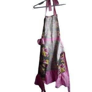 Floral Rose Pink Green full Apron with bow accent tie neck and back