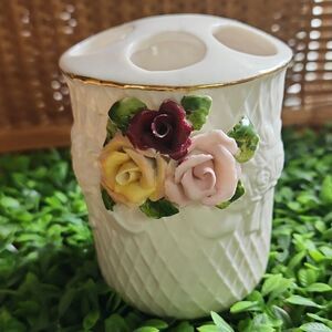 This little brush holder has such a romantic cottage core look with its yellow, pink and maroon roses. Embossed florals are on each side and the back. A lattice pattern is shown throughout, with a gold tone accented rim. Use on your desk for pens & pencils, your vanity for makeup brushes, by the sink for toothbrushes or in your art studio for small paintbrush.