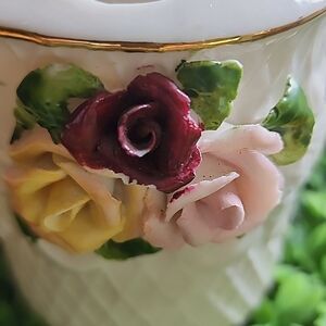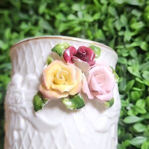 Floral Roses Porcelain Brush Holder With Lattice Weave Embossed Florals Coquette