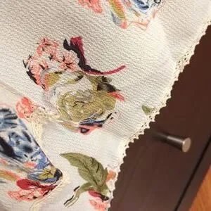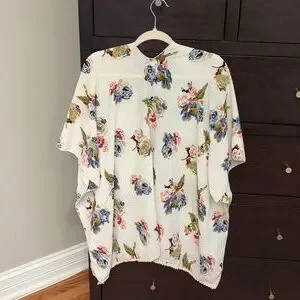 Beautiful floral Ruana that's perfect for covering up on a hot day. Protect yourself from the sun in style. Great lace trim details.