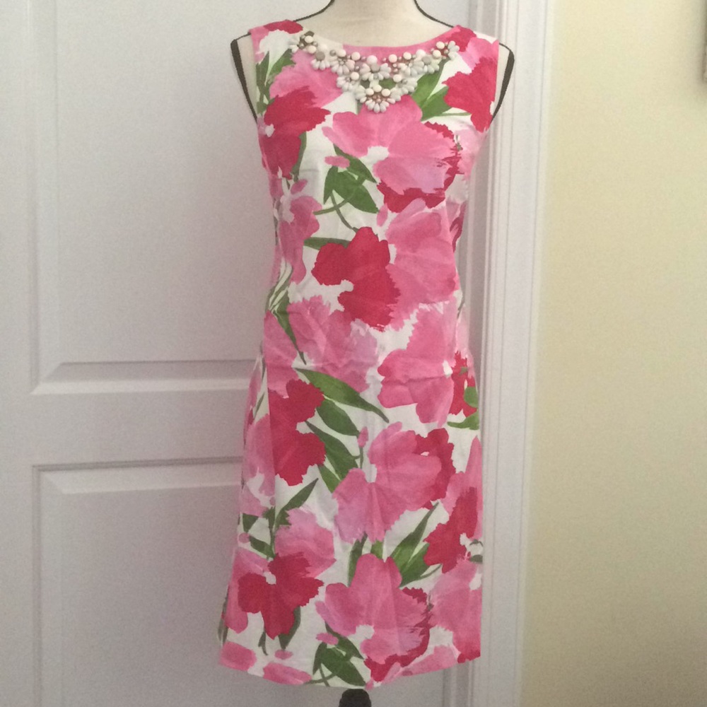 I absolutely fell in love with this dress as soon as I saw it, then I only wore it once. Size 14 (comfortably a large), stretchy, all beading in tact, zipper down the back, right above the knee (I’m 5’5”)