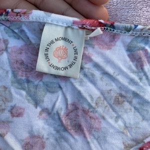 This shirt has a super adorable floral pattern with a ruched front and a drawstring tie on the bottom. It has small cap sleeves and is slightly cropped. It is a size small but it’s very stretchy so it could fit a medium as well. Washed once but never worn only tried on.