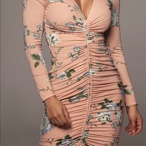 Vibrant Florals long sleeve midi dress. Flirty v-neckline, and flattering ruched front detailing with an adjustable drawstring tie for a desired length. Stretchy. Adjustable length. Double lined.